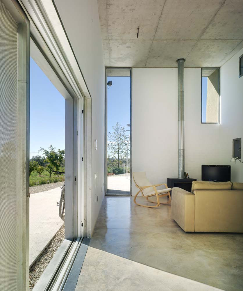 En el interior se vive bajo una losa inclinada de hormigón. Huecos pequeños controlados miran a la montaña, un gran hueco vertical mira al paisaje.